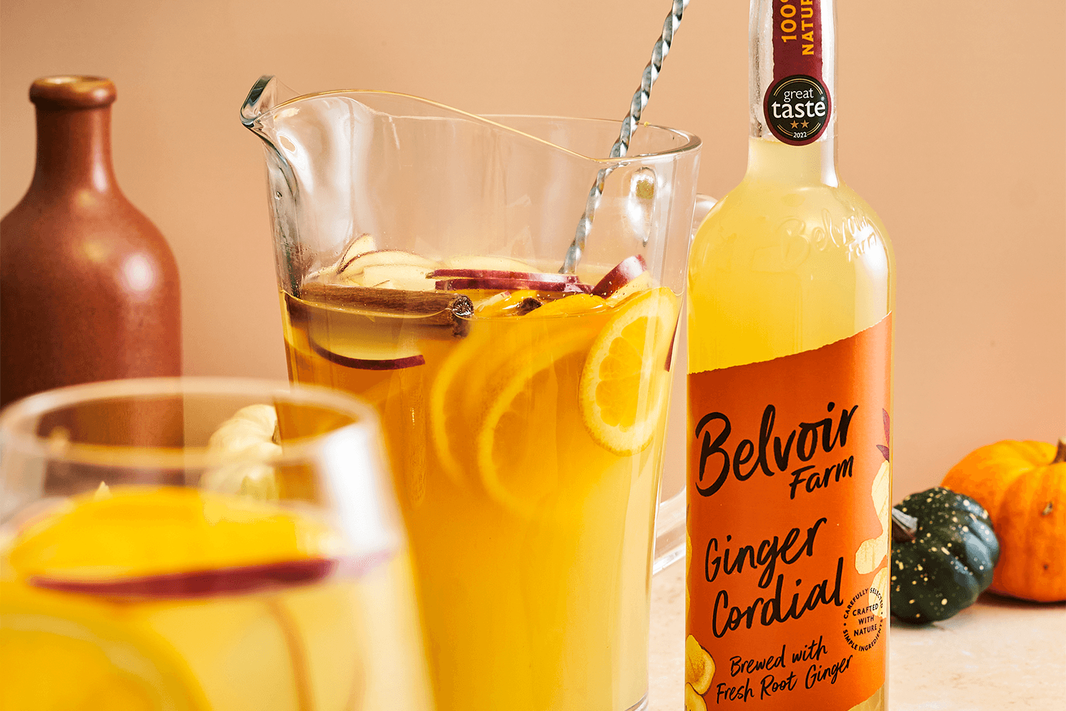 In a large jug, combine the white wine, Belvoir Farm ginger cordial, cloudy apple juice, and brandy.