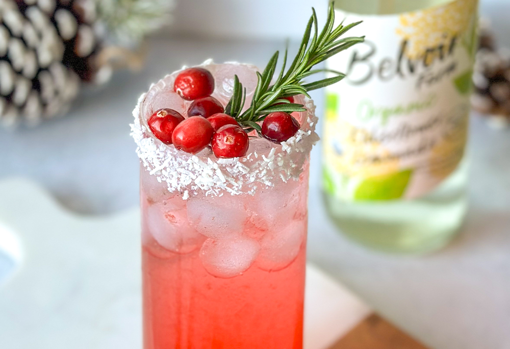 Finally, top with Belvoir Farm Sparkling Elderflower and garnish with fresh cranberries and a sprig of fresh rosemary.