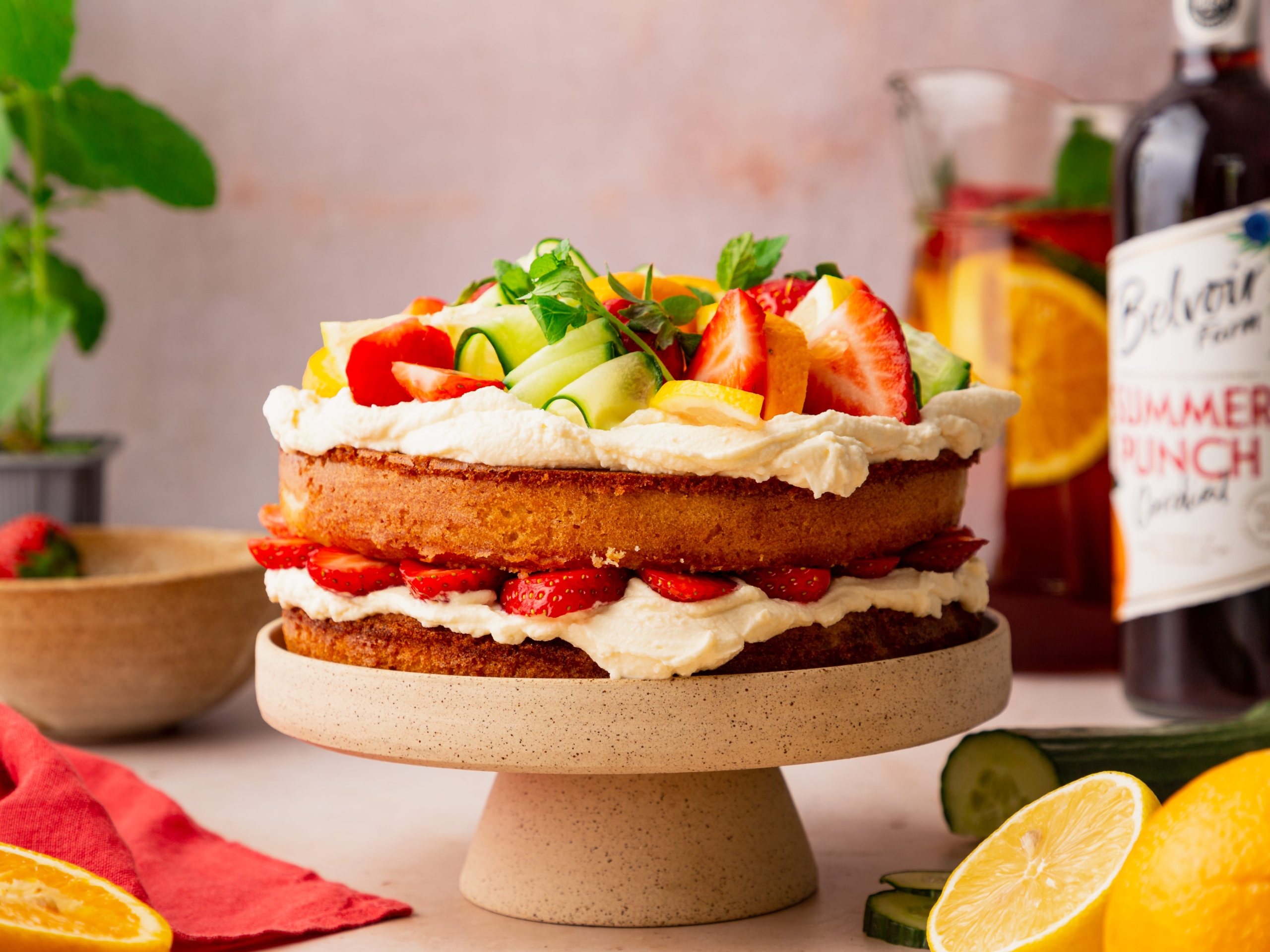 Decorate the cake with the remaining strawberries, mint, sliced oranges and lemons, and cucumber ribbons. Serve immediately